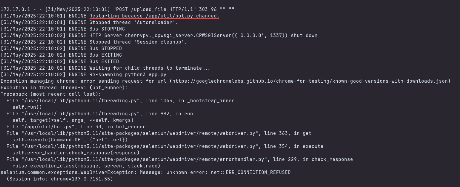 So the application is restarting because it noticed a change in the bot.py file. This is good news, as it means that our malicious code will be executed by the scheduler in the next minutes.