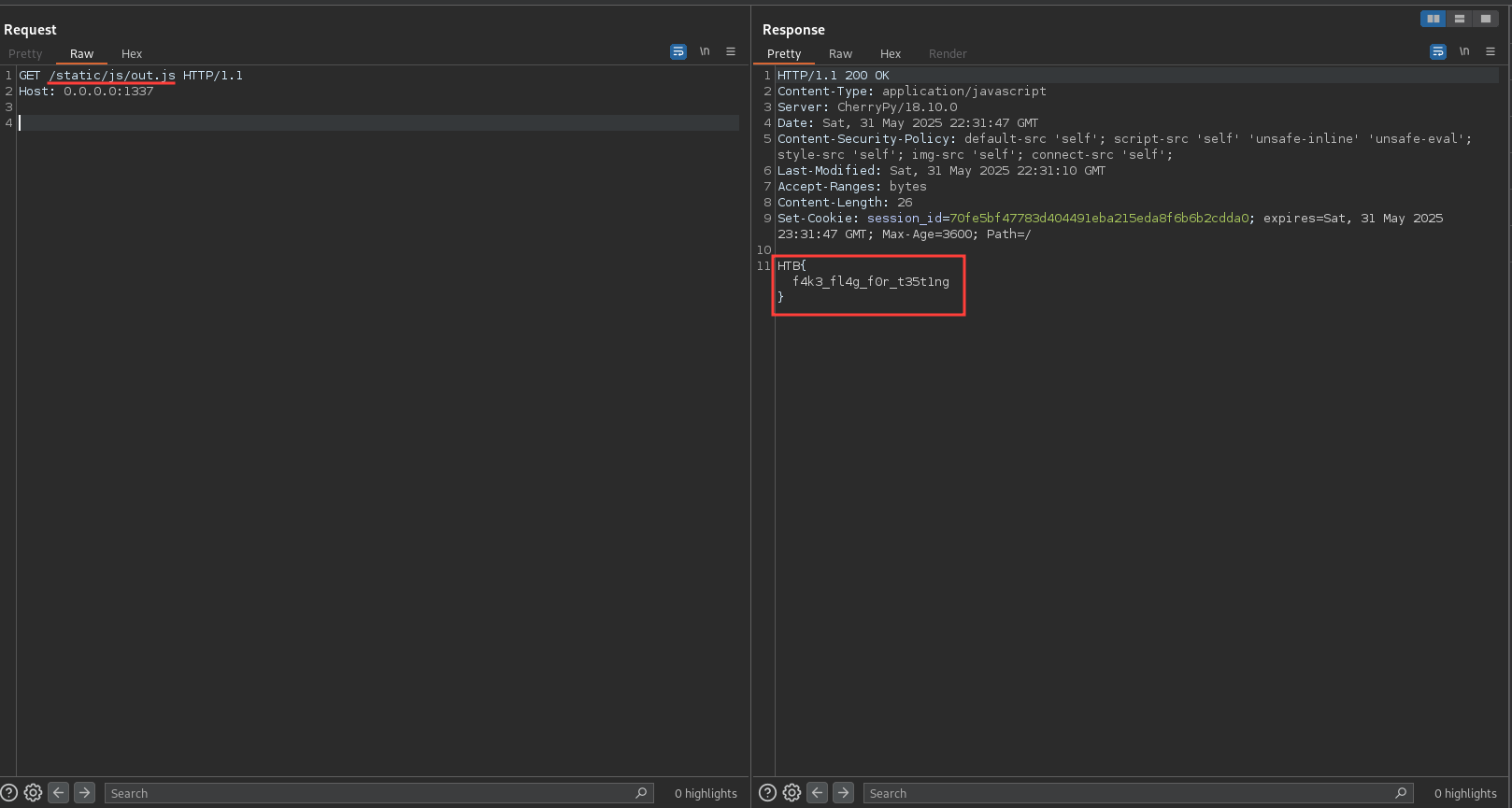 This Dockerfile sets up a Python environment with CherryPy and other dependencies. It also includes a readflag program that is set to run with elevated privileges (setuid). This is a hint that getting the flag will require RCE. We also notice that outbound traffic is blocked by setting the http_proxy and https_proxy environment variables to a local proxy.