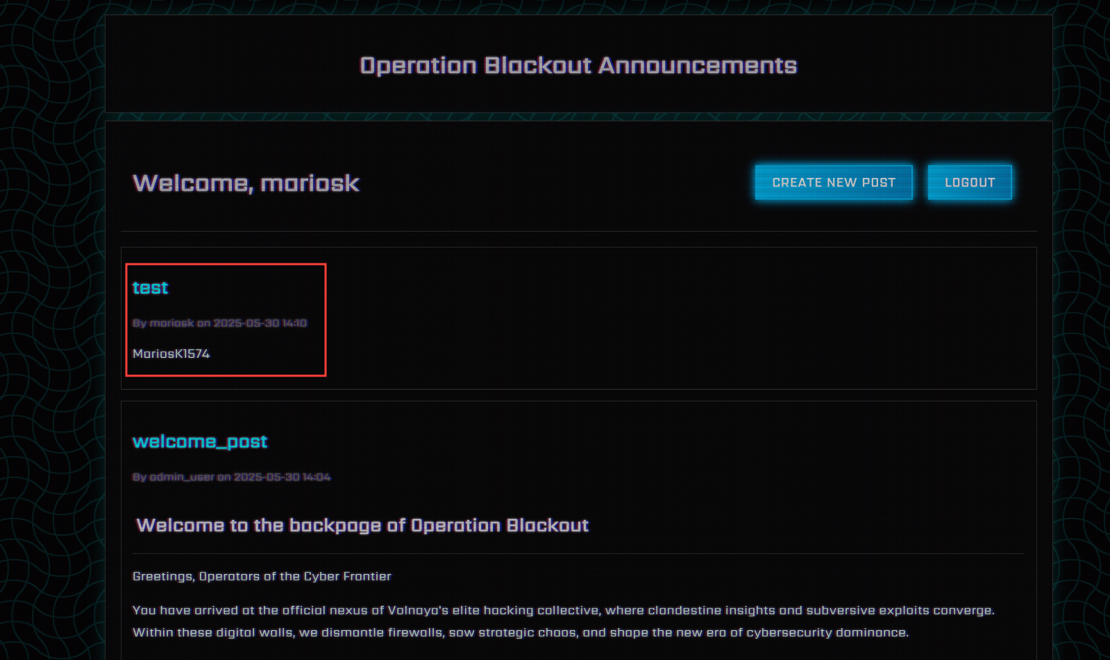 In order to steal the admin session, the most straightforward way is to try to find an Cross-Site Scripting (XSS) vulnerability. If we can inject JS code into a post, the admin bot logs in as the admin user every minute and views the posts, the XSS payload will execute in the context of the admin user, allowing us to steal the session cookie or any other sensitive information.