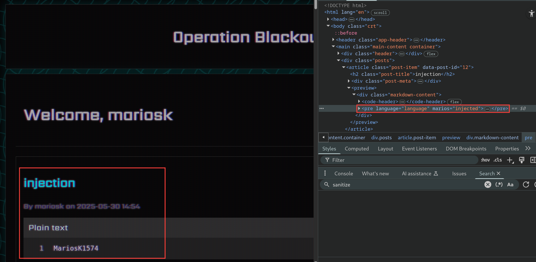It extracts the code language from the line and then uses it without any sanitization or validation. This means that we can use ' in the language to break out of the string and inject our attrbutes into the <pre> tag.