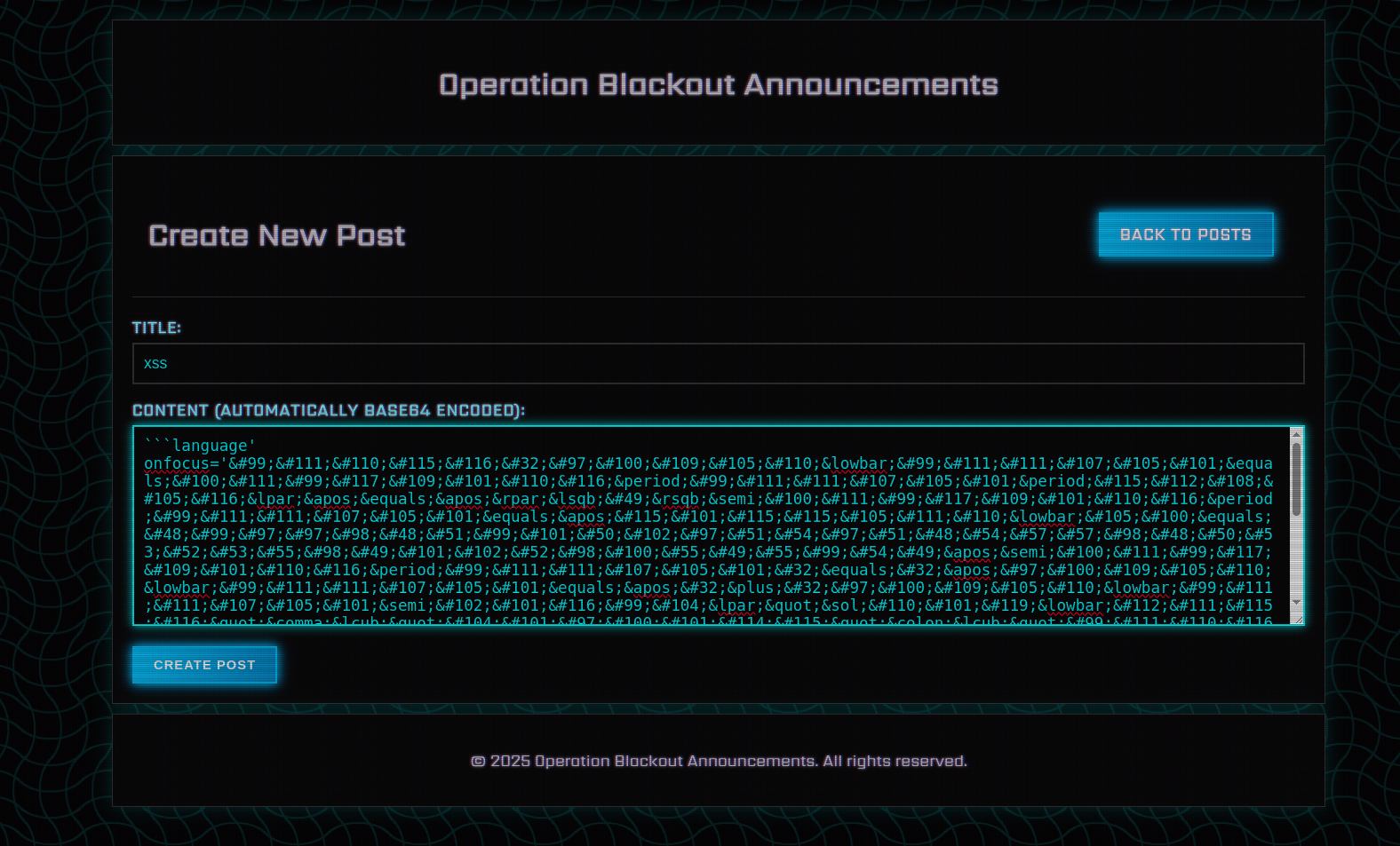 Perfect! We have successfully triggered our XSS payload. This means that when the admin bot visits the post, it will execute our JavaScript code.