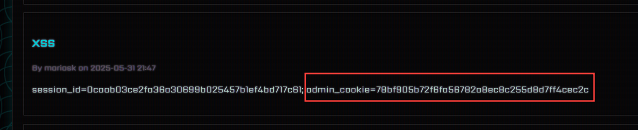 After about a minute, we see the post created by the admin bot with the admin’s session cookie in the content. Now we can use this cookie to access the admin page.