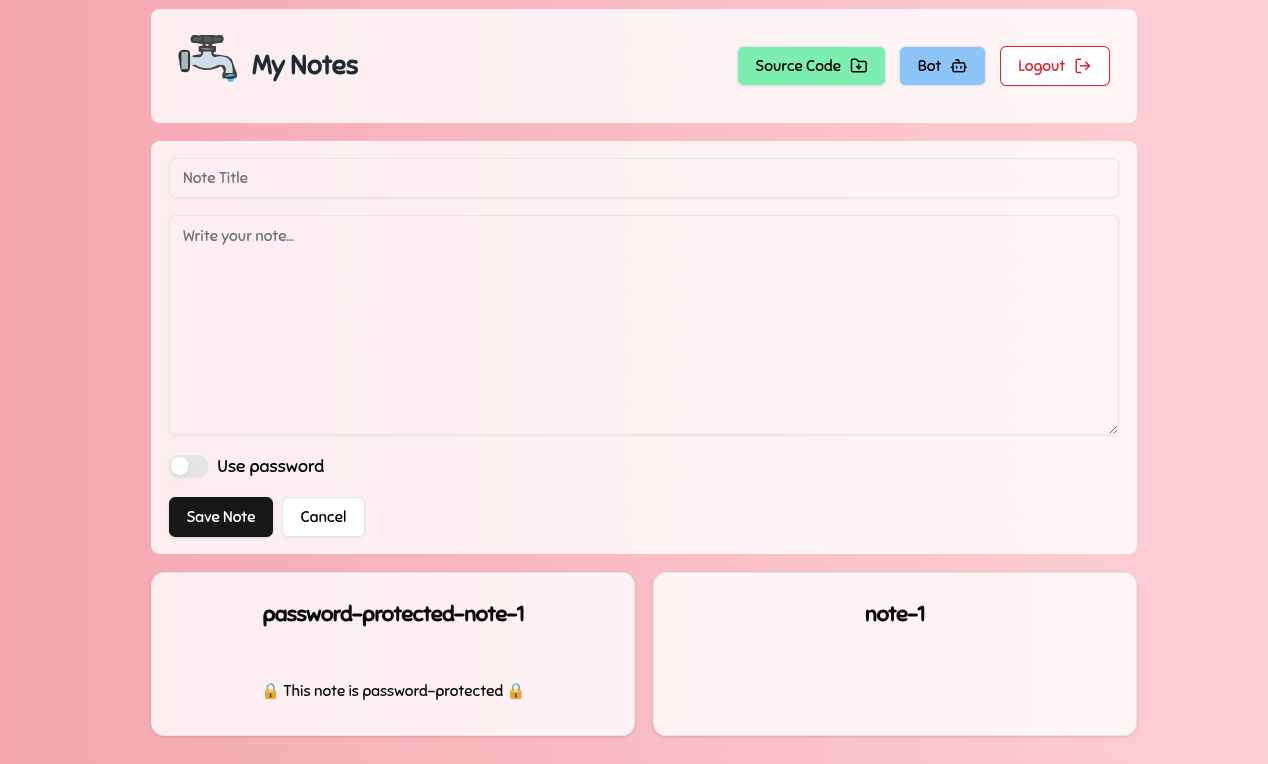 At first glance, the code seems fine. Upon closer inspection, we can see that both the postMessage and the event listener are not properly used. The former sends a message with a wildcard * origin, and the latter does not check the origin of the message, essentially allowing any origin to send messages to the page. Furthermore, this page does not only process the password-protected notes. If you send a message with the type submitPassword and "" as the password, the page will process the message and return the id of the first password-less note.
