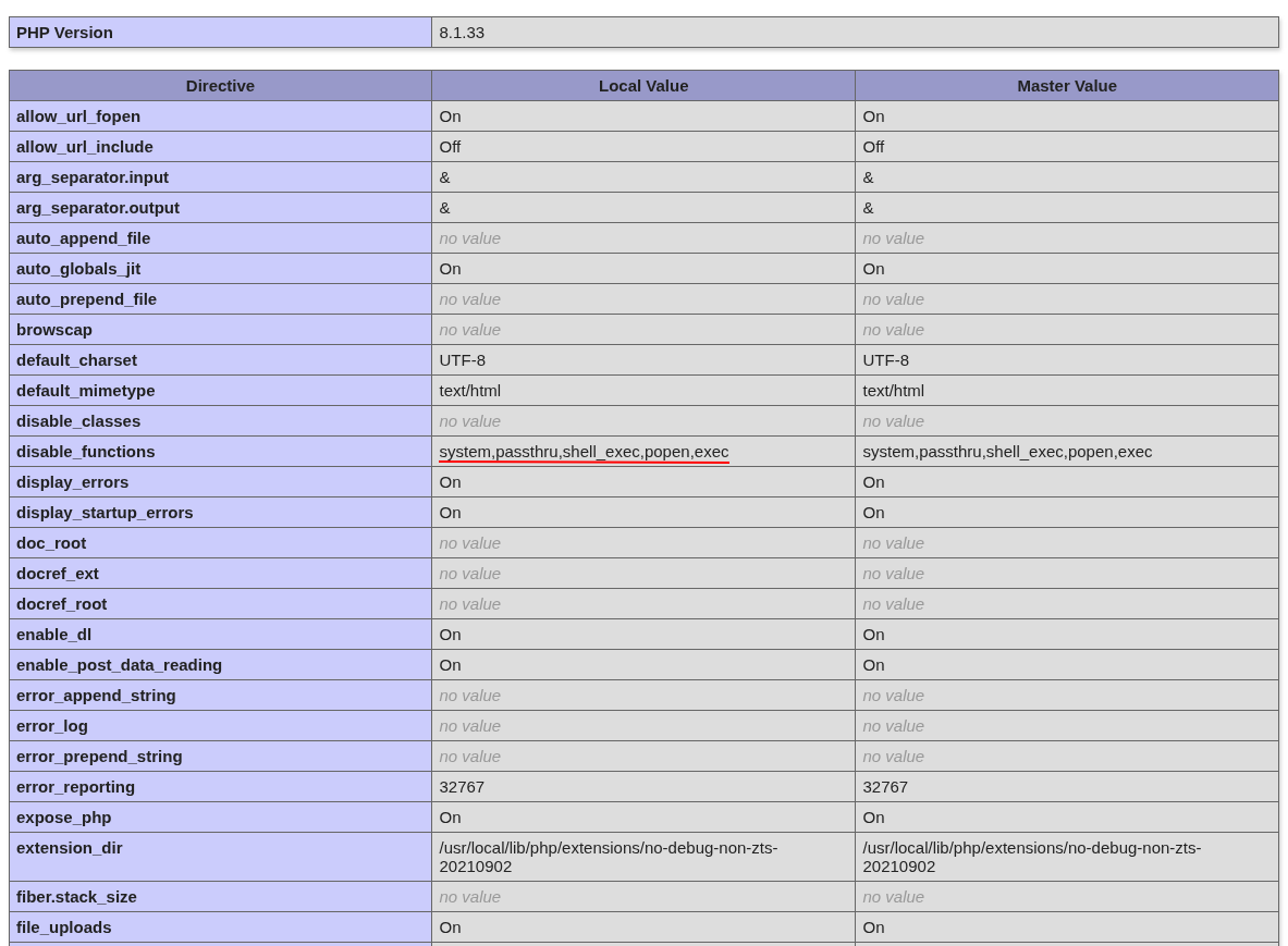 function is disabled in the PHP configuration. Letās run phpinfo()