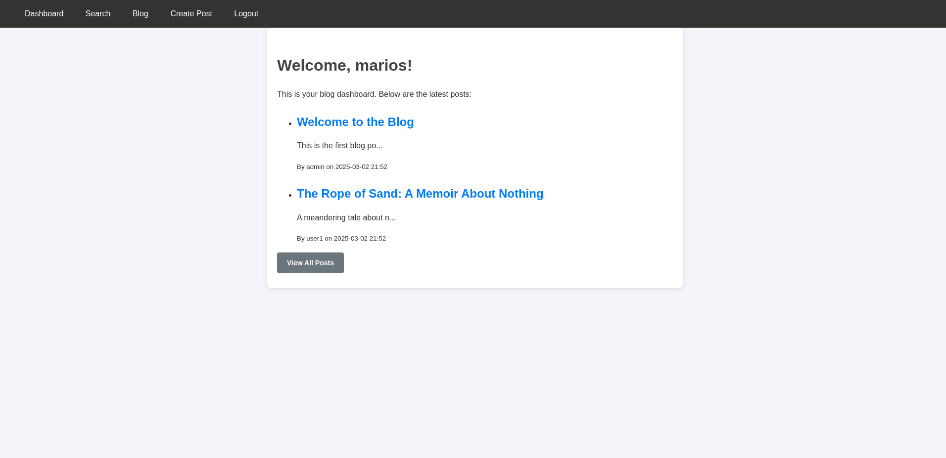 Now we have access to the dashboard, where we can see a list of blog posts. We can also create new blog posts and search for blog posts given a search query.