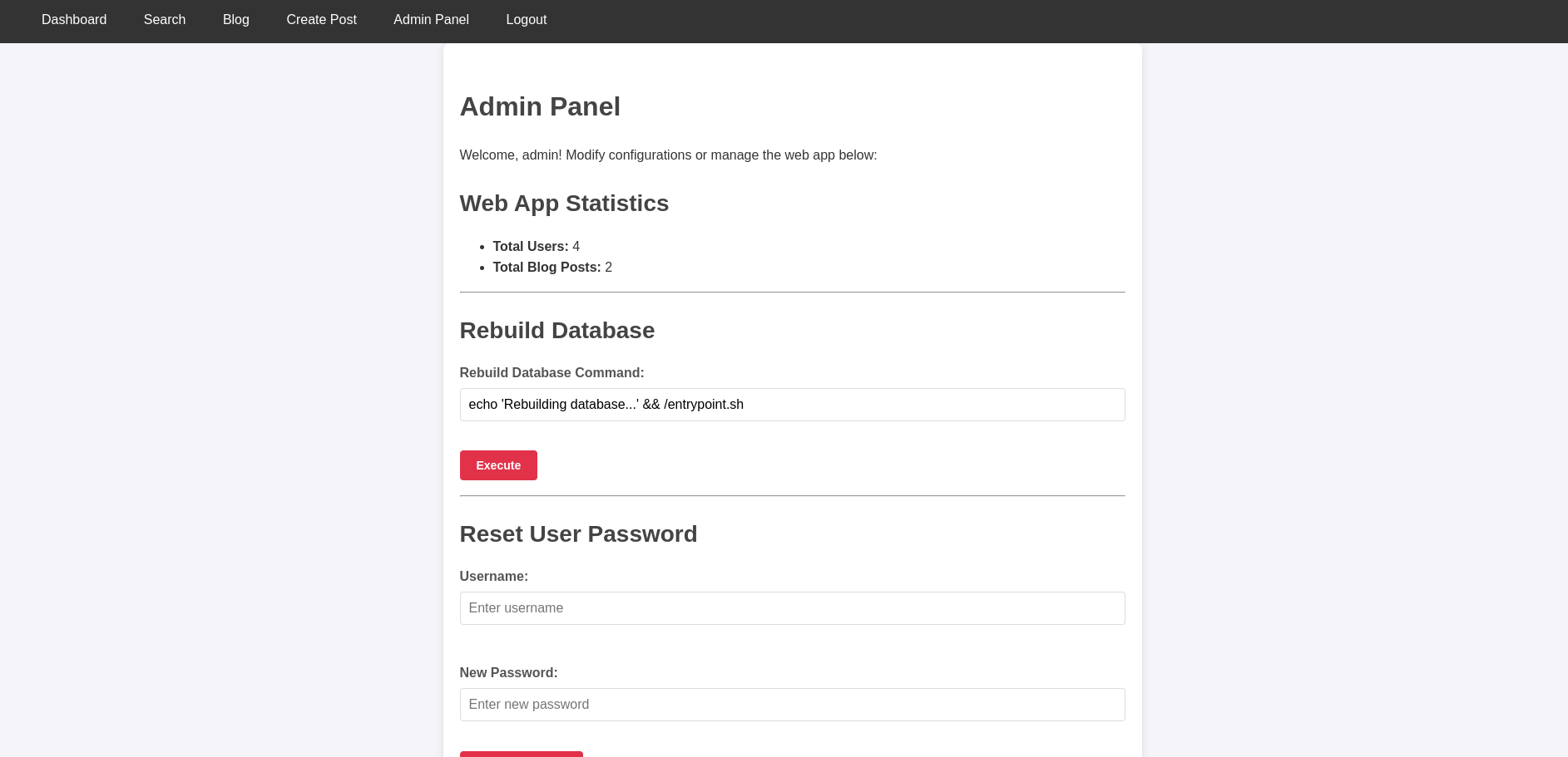 Taking a look at the /admin endpoint, we can see that the application checks if the user has the role admin before allowing them to access the admin panel. The application displays the number of users and blog posts in the database. The administrator is also able to execute commands on the server. The command given by the admin is validated to ensure that it starts with the default command and does not contain any disallowed characters. The application then executes the command and displays the output. If we pay close attention we realize that the disallowed characters are not a sufficient protection against command injection.